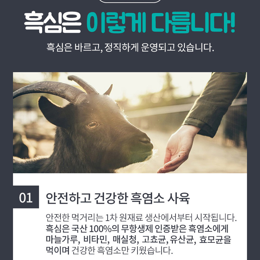 - 1. 엄선된 흑염소 진액 , 철저한 품질 관리로 흑염소에서 추출한 진액만을 사용하여 영양이 풍부해요.